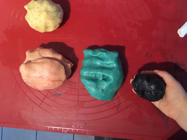 schwarzen, Türkisen, rosa und naturfarbenen Teig. - Der Backofen kann inzwischen auf 200 Grad Umluft vorgeheizt werden.