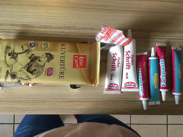 Hierfür mischt ihr den Puderzucker mit sehr wenig Wasser, bis es die Konsistenz hat, die ihr richtig findet. Ich habe noch rosa Lebensmittelfarbe mit dran gemischt.