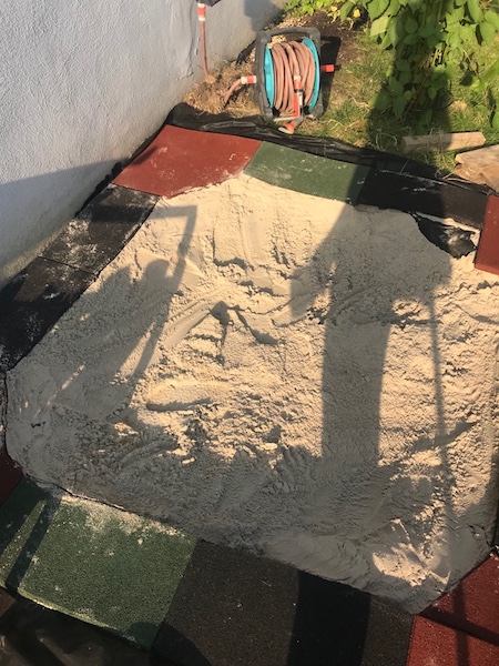 Als 1. stand dieses unschöne Erdloch an. Ich überlegte hin und her wie ich das einfach schöner machen könnte, ohne einen neuen Sandkasten kaufen zu müssen. Wir grasten den Baumarkt ab. Wenn ich da so rumlaufe, kommen mir meistens die besten Ideen. So war es auch. Ich kaufte erstmal Unkrautfliess, neuen Sand und gummierte Matten in den Farben rot, grün und Schwarz. Leider gab es kein Blau. An einem lauen Sommerabend legte ich also los und entleerte das Erdloch. Ich legte das Unkrautfliess doppelt aus und befüllte alles mit Sand. Nun mussten diese dicken Matten zurechtgeschnitten werden um eine Umrandung für den Sandkasten zu bilden. Das war mega schweißtreibend aber ein Brotmesser war das beste Werkzeug. Nach insgesamt 4 Stunden war alles fertig und konnte sich sehen lassen.