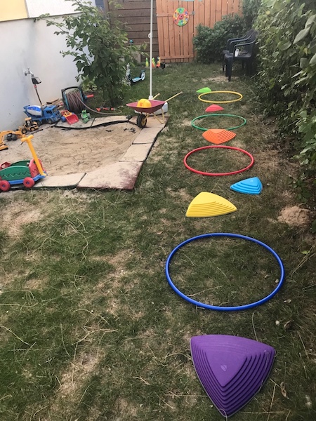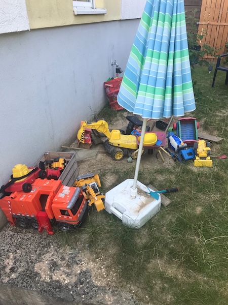 Aktuell besteht unser Spielplatz im Garten aus einem Sandkasten, einem Trampolin und einer Bewegungsbaustelle, die immer wieder anders aufgebaut wird. Gerade gerne als Hürden fürs Pferdespringen. An den heißen Tagen gab es eine Wasserbahn dazu und der Rasenspränger ist auch sehr beliebt.