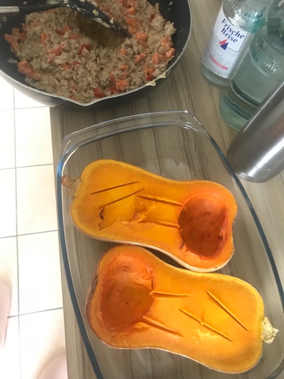Ihr beginnt damit den Butternut in der Mitte zu Teilen und zu Entkernen. Dieser kommt dann für 30 Minuten bei 170Grad Umluft in den Backofen.