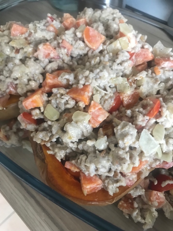 Der Butternut ist inzwischen schon gut weich und ihr legt die 2 Hälften in eine Auflaufform und gebt eure Füllung darüber.