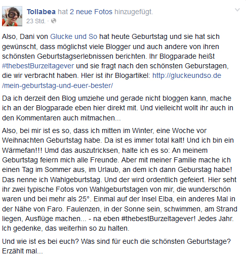 Hey Dani, bei uns (Essential Unfairness) treten unsere Geburtstage durch die Familie ziemlich in den Hintergrund. Mrs. Essential hat am gleichen Tag Geburtstag wie mein Vater und ich fast am selben wie Nummer 1 – da bleibt für uns nicht viel übrig  Daher haben wir hier nicht so unglaublich viel zu berichten, dass es für einen Blogpost reichen würde. Aber ich bin sicher Du bekommst einige tolle Beiträge!