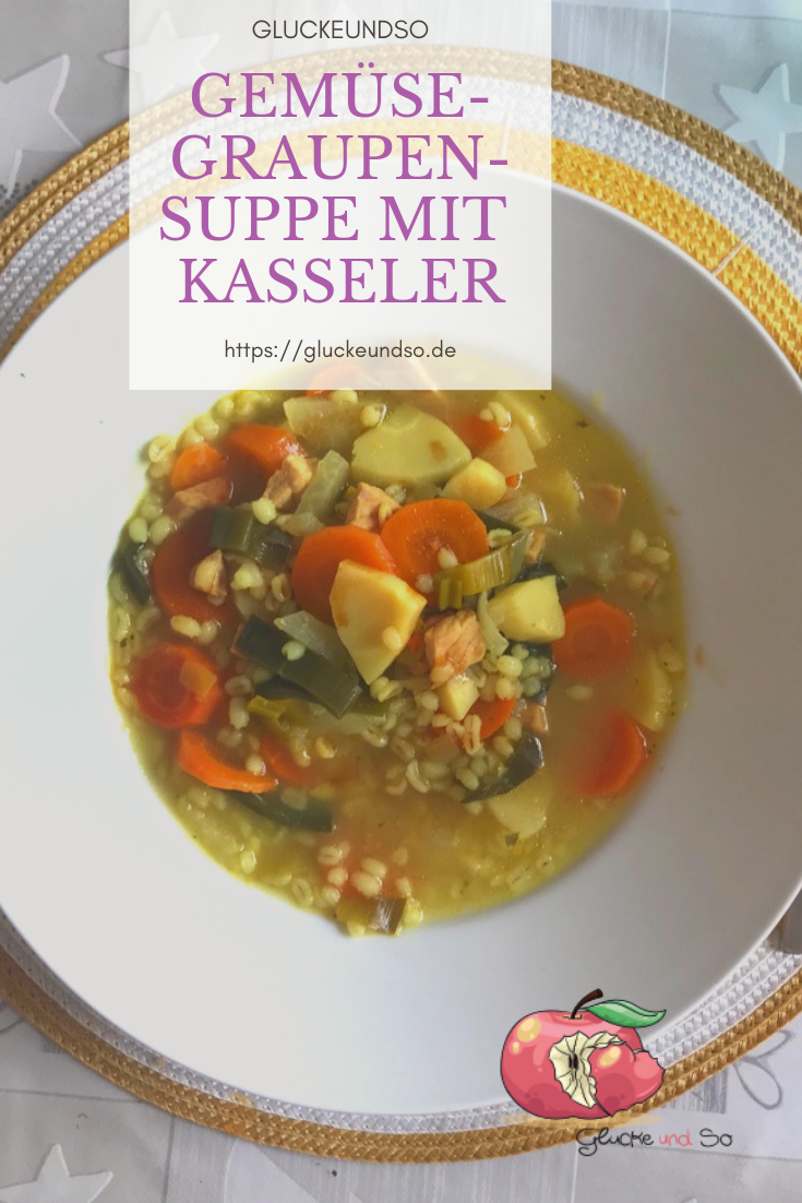 Viel Gemüse sollte es sein, denn Graupen werden ja eh meist nur für die Auffüllung von Suppen genommen. Den Kasseler kann man locker weglassen aber auch diesen liebt mein Mann sehr und wir essen nur am Wochenende Fleisch, also war es für den Geschmack ganz gut.