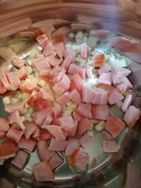 Nun wird alles in mundgerechte Stücke geschnibbelt. Ihr nehmt einen großen Topf und giesst etwas Rapsöl hinein. Jetzt wird die Zwiebel und der Kasseler mit Kurkuma vermischt und bei voller Stufe angeschwitzt.