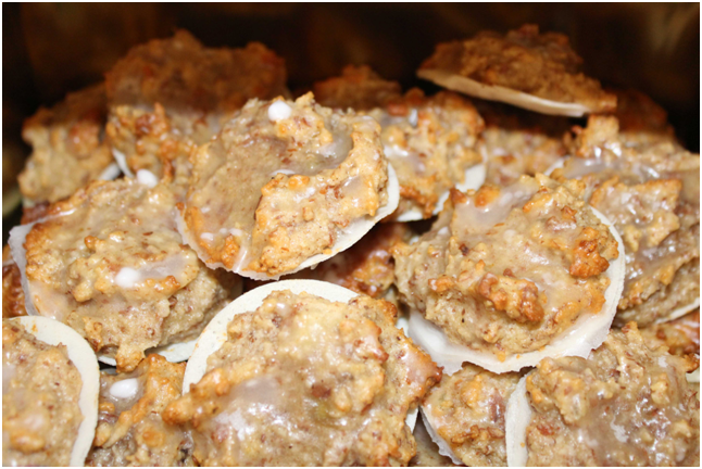 8. Nachdem Erkalten mit Puderzuckerglasur überziehen (Puderzucker und Wasser (oder Rum) mischen (etwas dünner) und trocknen lassen).