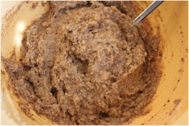 5. Eiweiß, Mandeln und Mehl, Orangenat, Zitronat, Lebkuchengewürz nach und nach unter das Marzipan per Hand rühren