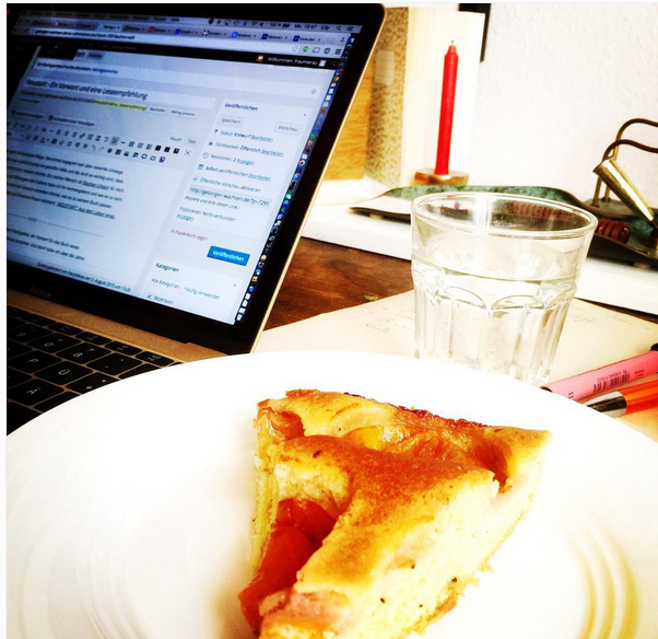 Es gibt bei uns keine total normalen Wochentage, glaube ich. Wir sind ja beide Selbständig und die Kinder sind zu Hause. Deswegen bringt jeder Tag immer wieder neue Herausforderungen mit sich, weil das Leben mit Kindern und Arbeit neu organisiert werden muss. Beispielsweise an einem Mittwoch wie heute: Die Kindergarteneingewöhnung des Sohnes muss ausfallen, weil er krank ist. Die große Schwester ist auch zu Hause, weil Sommerferien sind. Ich habe mittags aber ein wichtiges Telefonat, das ich beruflich führen muss. Daher treffe ich mich mittags mit Caspar zum Mittagessen: Während er mit den Kindern das Essen im Restaurant bestellt, telefoniere ich draußen etwa eine halbe Stunde lang. Danach habe ich einen Vorsorgetermin bei der Frauenärztin (meine Hebamme ist noch in den Sommerferien), aber wegen der Krankheit des Sohns kann ich ihn nicht mitnehmen. Deswegen muss Caspar nach dem Essen bei den Kindern bleiben. Anschließend machen wir wieder eine Übergabe und er arbeitet weiter. Abends, wenn die Kinder schlafen, arbeite ich an Artikeln oder meinem Buch.