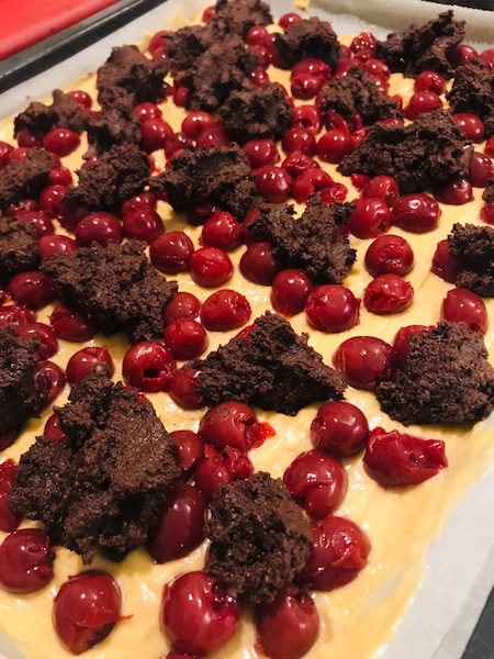 Ihr fettet nun euer Backblech ein oder nehmt wie ich Backpapier drunter. Der helle etwas flüssige Teig wird nun gleichmässig verteilt und schön glatt gestrichen. Als nächster Step folgen die Sauerkirschen, diese nehmen das komplette Blech ein und das macht diesen Kuchen so unglaublich saftig.Maulwurfkuchen Blech belegen
