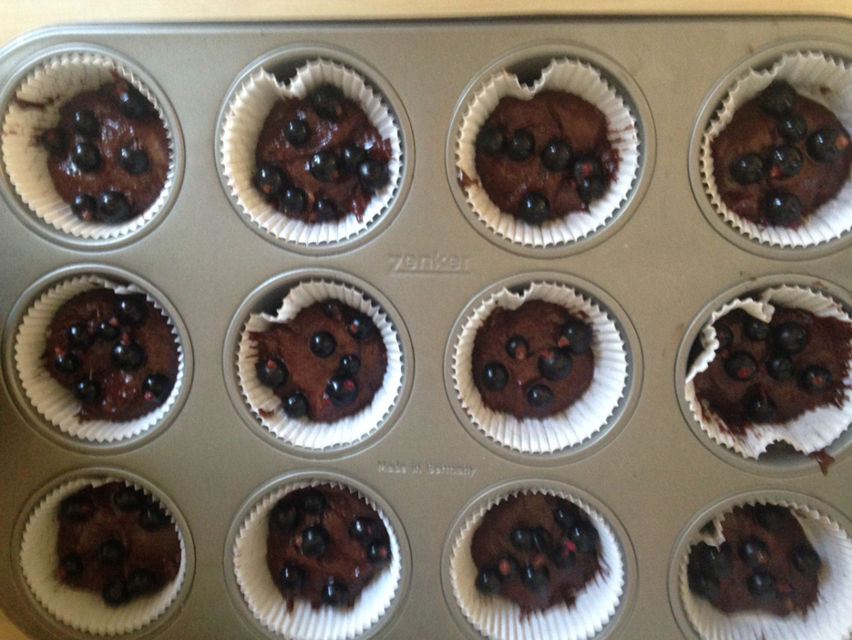 Je einen Klecks Schokoteig in einer 12er Muffinform verteilen, so dass der Boden gute 1-2 cm bedeckt ist. Dann in jede Form ein paar Beeren legen