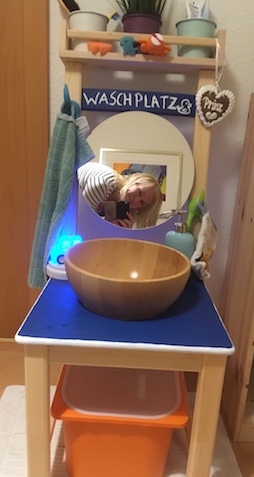 Wir stellten es an seinen Platz und ich füllte etwas Wasser in das natürlich rausnehmbare Waschbecken. Nun gings los. Ich glaube der Prinz wusch 100Mal seine Hände und 2 Mal die Zähne. Er sprach mit seinem Spiegelbild und kämmte meine Haare.