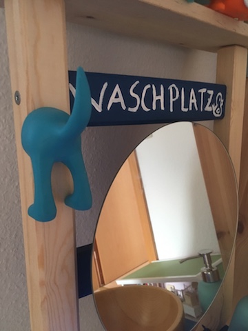 Da der Prinz Buchstaben über alles liebt, dachte ich mir-schreibe ich auch Waschplatz auf seinen Waschplatz. Das Quietscheentchen ist mir gut gelungen oder?