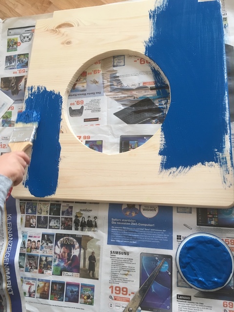 Als die Sägearbeiten erledigt waren-begann ich mit dem Abschleifen der Ränder, damit sich niemand einen Splitter zieht. Der Prinz hatte sich blaue Wetter-Dauerschutz-Lasur ausgesucht und für das Waschbecken hatten wir noch einen Kieferton-den wir für das Hochbeet genutzt hatten.
