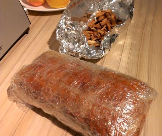 -dann das Fleisch in Frischhaltefolie ganz eng und großzügig einwickeln (läuft ein bisschen aus) und in den Kühlschrank
