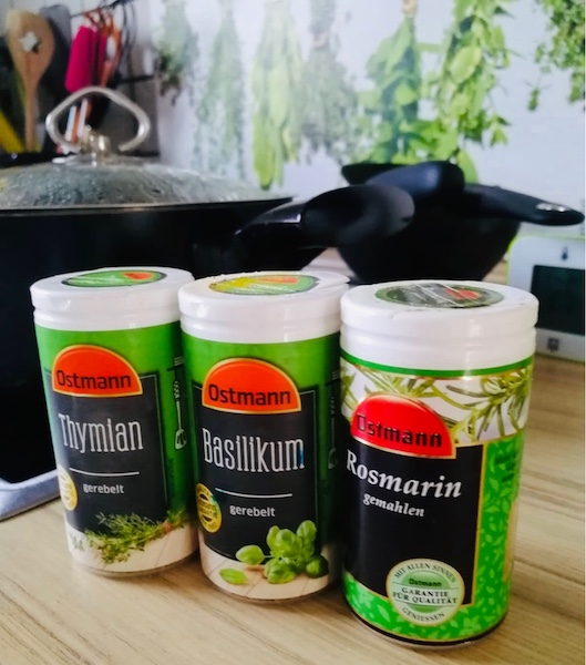 - getrocknete Kräuter(Thymian, Rosmarin und Basilikum) Im Sommer wenn ihr frische Kräuter im Garten habt, dann ist frisch natürlich besser