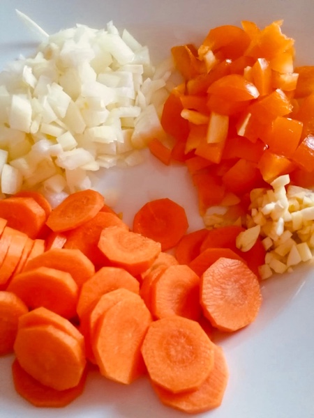 - Ihr schält die Möhre, die Zwiebel und den Knoblauch, schneidet alles in kleine Stückchen und schwitzt nun in 2Esslöffel Olivenöl alles an.
