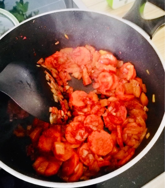 - Als nächstes kommt das Tomatenmark und der Zucker dazu. Alles schön Umrühren mit kurz bei voller Hitze anrösten.