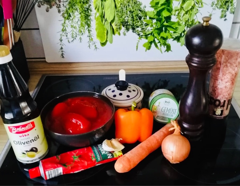 Für meine schnelle Tomatensuppe mit Reiseinlage, für 4 Personen benötigt ihr: