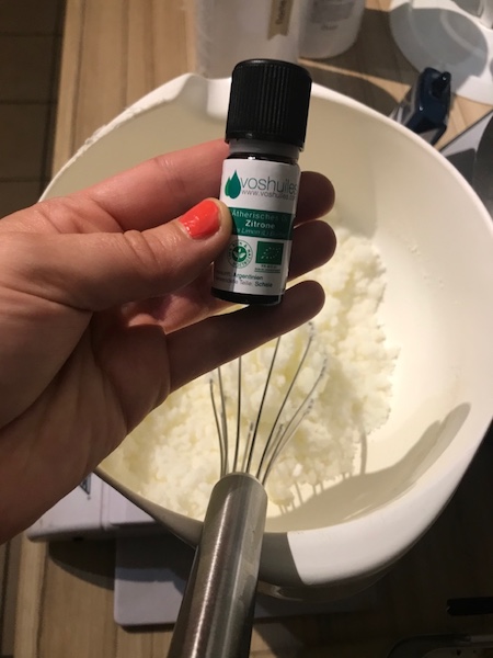 - nun kommt das flüssige Kokosöl und das Zitronenöl dazu. Wenn die Konsistenz gut ist um etwas zu formen, ist es perfekt, wenn nicht fügt ihr entweder noch etwas Kokosöl oder aber Stärke hinzu.