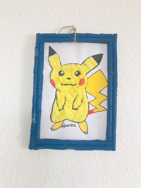 machte ich eine kleine Schlaufe um das Bild dann später aufzuhängen. Der letzte Schritt war es, das Pikachu Bild aus Playmais hinter den Rahmen zu Kleben. Ich habe Test genommen, da wir so auch einfach und schnell das Bild tauschen konnten.